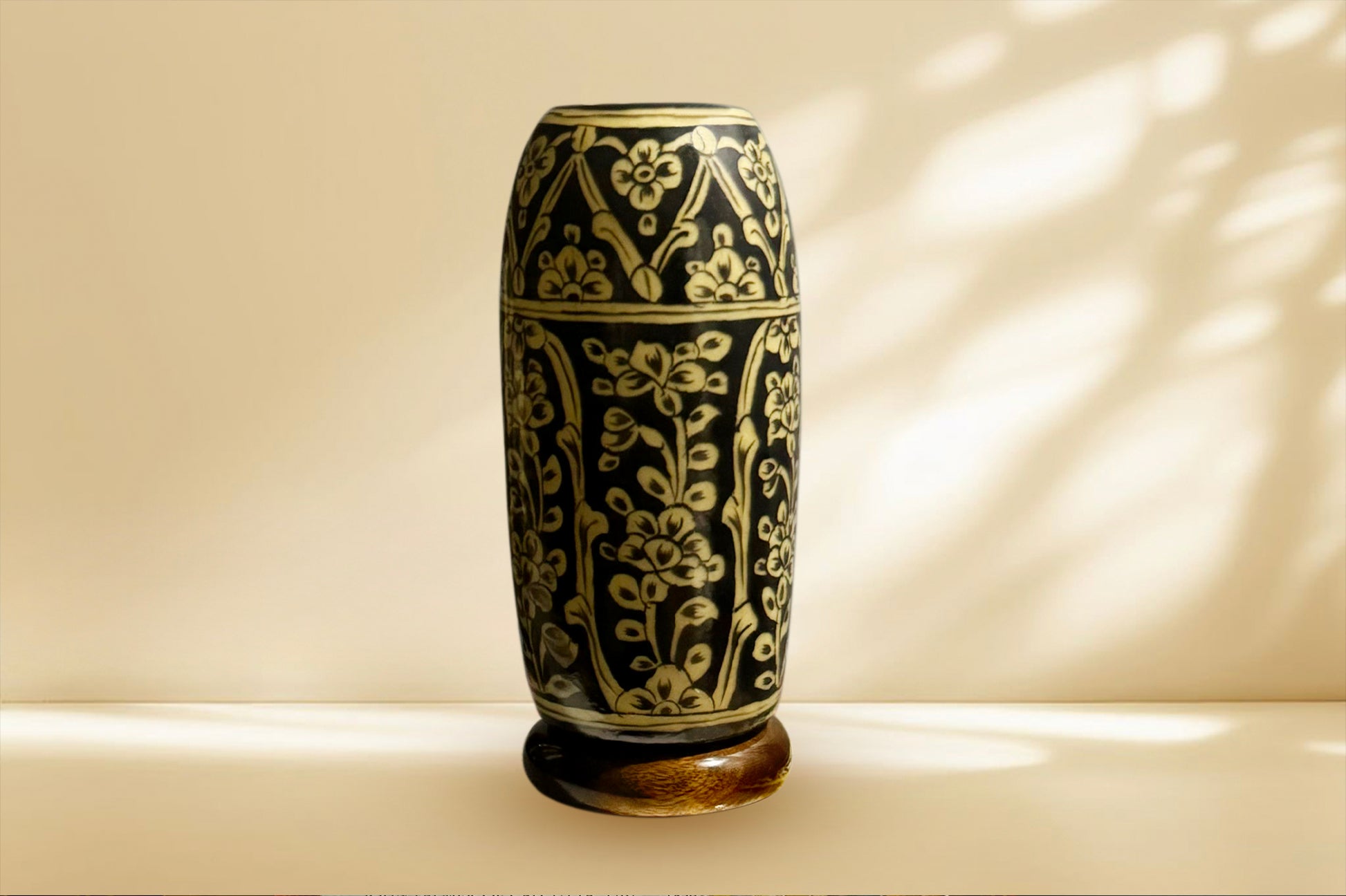 Timeless elegance meets artisan detail in the Obsidian Bloom Lamp. Hand-painted beige floral motifs bloom softly over an obsidian-black body, adding quiet drama and graceful contrast to your space. Each detail is sealed with a clear protective lacquer to preserve its lasting beauty.
